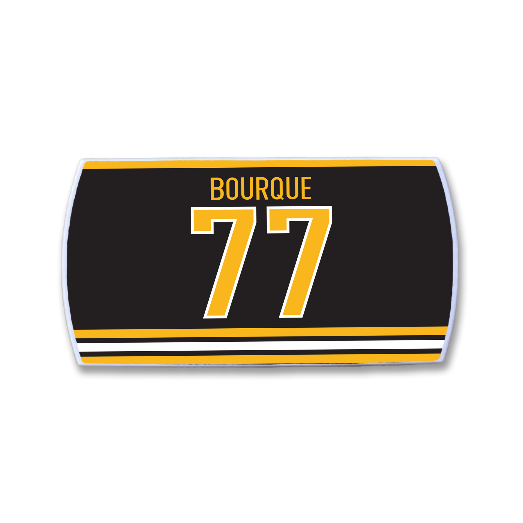 The ZippyBack™ Ray Bourque nameplate is a black hockey jersey patch with yellow and white stripes, displaying BOURQUE above the bold yellow and white number 77—celebrating the legendary defenseman’s legacy.